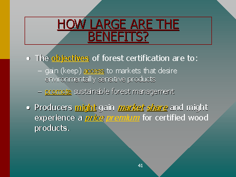 The benefits of forest certification at the present time appear to be in keeping or enhancing market share rather than obtaining higher prices for forest products. However, in some niche markets, tight timber supplies may lead to higher prices for products.
