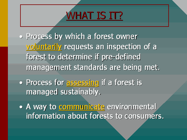 It is important to understand that forest certification is a voluntary program. This is in contrast to governmental regulations that are involuntary. If large buyer groups and consumers of forest products demand certified products, forest certification could effectively become required for forest owners who wish to retain market share.