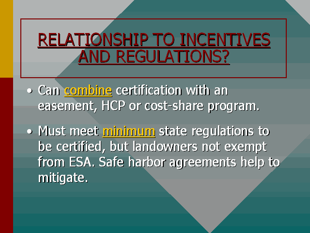 Land owners must meet or exceed all governmental regulations when seeking to become certified. However, because conservation easement, HCP, cost-share and certification programs produce overlapping benefits, land owners may wish to combine programs with one another. This should produce greater combined benefits for the land owner -- especially if the costs are not too large. Land owners should also investigate safe harbor agreements available to them if they engage in selected conservation programs.