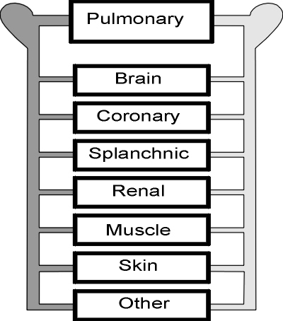 The distribution of the cardiac output among the organ vasculatures determines the convective distribution of heat within the body. Brain, coronary, splanchnic and renal vasculatures receive, altogether roughly 70% of the cardiac output in a healthy person at rest (11). High blood flow rate per unit mass in these organs and in the lungs results in small differences between their arterial and venous temperatures and rapid response of intra-organ temperatures to changes in arterial temperature. Altogether, these organs and the lungs can be regarded as a single thermal compartment in which temperatures are nearly identical to temperature in the pulmonary artery, Tpa The reductions in cardiac ouput and organ blood flow that occur in chronic heart failure may result in somewhat higher temperatures in the organs, relative to Tpa, and slower responses of organ temperatures to changes in thermal balance that alter Tpa.