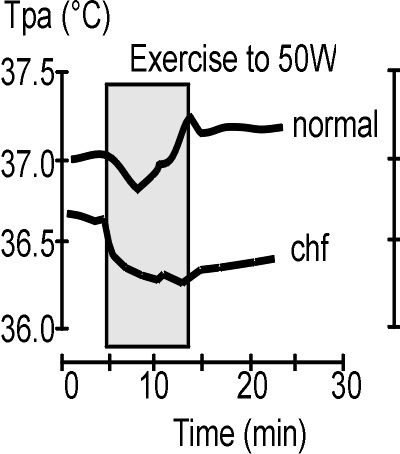 Core temperatures in a typical normal subject and typical patient, measured in the pulmonary artery (Tpa). From data of Shellock, et al (17) in a study of class III and IV heart failure patients and age-matched normal subjects. Rectangle indicates period in which subjects exercised on a bicycle ergometer in successive three-minute periods at work loads of zero, 25W and 50W. Heart failure patients had lower Tpa prior to exercise (36.95 versus 37.28° C) and still lower Tpa at the end of the exercise period (10 min post-exercise Tpa 36.87 in patients versus 37.43 in normal subjects). Also, deep muscle temperature from the vastus lateralis was lower in patients before exercise (34.8 versus 36.2° C) and did not rise above Tpa during exercise (muscle temperature at completion of 50W exercise 36.5 in patients versus 38.0° C in normal subjects).