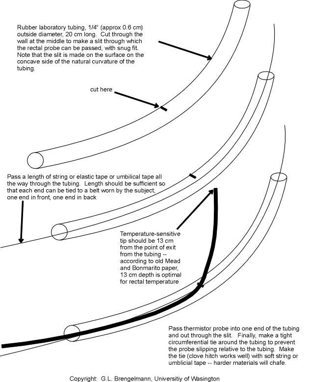 In the collaboration with Loring Rowell that resulted in the 1969 publication "Human cardiovascular adjustments to rapid changes in skin temperature during exercise" Rowell,L.B., Murray,J.A., Brengelmann,G.L., Kraning,K.K. Circulation Research 24: 711 - 724, we needed to record rectal temperatures in men exercising hard. The probes tended to slip out during the long sessions. I developed a simple system fabricated from supplies in the laboratory that solved the problem. Since then, the technique has been applied in numerous other studies with men and women who were exercising or carrying out their daily activities in round-the-clock monitoring of circadian rhythms. The probe remains reliably in place and subjects complain of no discomfort. The difficulty of manufacture and cost of materials are both minimal, so probe holders can be discarded after a single use.