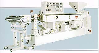 Polyethylene pellets are melted in an extruder, as seen on the here. They are melted as they are pushed through the machinery with a screw-like mechanism. Once the pellets are melted, they are pushed between parallel plates to make a flat sheet. The flat sheet is then drawn out as a falling film and cooled. |