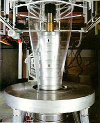 In the case of trash bags we are interested in a cylindrically shaped product. This picture shows that when polyethylene is extruded in this shape it forms a large bubble.The bubble is cooled, and then can be cut and sealed on the bottom to result in the trash bags we all use.