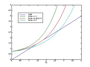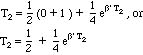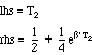 The left-hand side is a straight line with slope 1 going through the origin. The right-hand side starts at 0.75 for T2 = 0. As T2 is increased the curve moves up at an ever-increasing rate. See the figure. Now it is clear that if b' is so large that the curve moves up too soon, then it can never intersect the line of lhs = T2. Yet if b' is zero, then the two curves clearly intersect. Thus there is a value of b' above which no solution exists.