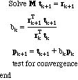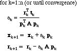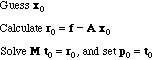 The conjugate gradient method is an iterative method which can solve a set of n linear equations in n iterations. Since the method mostly requires multiplying a matrix by a vector, which can be done very efficiently on parallel computers and for sparse matrices, this is a viable method. The orignial method was devised by Hestenes and Stiefel [1952], but current implementations all use a preconditioned conjugate gradient method because it converges faster, provided a good "preconditioner" can be found. A description of an efficient implementation of such a method is by Eisenstat [1981]. The system of n linear equations Ax = f, where A is symmetric and positive definite, is to be solved. A preconditioning matrix M is defined in such a way that the problem Mt = r is easy to solve exactly. (M might be diagonal, for example). Then the preconditioned conjugate gradient method is:
