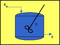 Consider a stirred tank reactor, shown in the figure. The flowrate coming in and out is the same (hence the total volume of fluid in the vessel remains constant), and in steady state a mass balance gives the change of moles in the vessel equal to the rate of generation (or removal) of the chemical in the vessel. A typical equation governing the concentration out of the reactor is