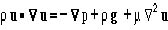 where the first term is the inertial terms, the next term is the pressure gradient, the next term is the acceleration due to gravity, and the last term is the viscous term. The continuity equation for an incompressible fluid is