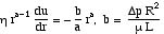 where R is the radius of the pipe or half the distance between the two plates, and p/L is the pressure drop per unit length, which is a constant. The equation is written so that b is positive, and µ is some characteristic viscosity. The parameter a = 1 for planar geometry (flow between flat plates) and a = 2 for a pipe or cylindrical geometry. The h is the viscosity, or actual viscosity divided by µ, and it can depend on the velocity gradient. The goal is to compute the average velocity as a function of the pressure drop, or b. We integrate the equation once to obtain