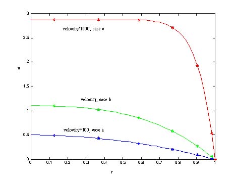Case a has a velocity profile that is almost parabolic, case b has a flatter velocity profile, and case c has an even flatter profile. These solutions were obtained using 7 collocation points, and plotting the results using the polynomial solution (not straight line interpolation). The convergence with number of collocation points is shown in the table.