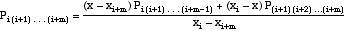 The error is of course zero at the points used in the interpolation, but it is non-zero in between those points. The evaluation of Pm(x) at a point other than at the defining points can be made with Neville's algorithm [Presset al. 1986]. Let P1 be the value at x of the unique function passing through the point (x1,y1); i.e. P1=y1. Let P12 be the value at x of the unique polynomial passing through the points x1 and x2. Likewise, Pijk...r is the unique polynomial passing through the points xi, xj, xk, ...xr. Then use the table