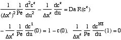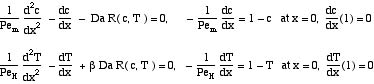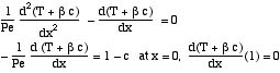 Now, steep gradients can be formed because as the reaction proceeds, energy is given off (for an exothermic reaction), and the reaction proceeds even faster. This problem has the feature that, if the two Peclet numbers are the same, the two equations can be combined into one. Multiply the concentration equations by b and add to the temperature equations. The result is