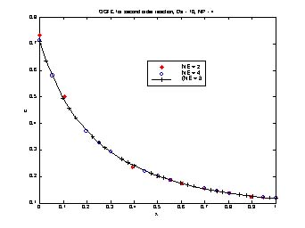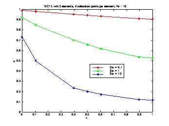are hardly changed when using more elements or collocation points; for small Damköhler numbers