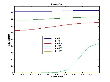 The radial profiles are shown in the next two figures, and illustrate the fact that, except for the hot spot, the radial profiles are quite flat. These figures confirm that fact that the radial profiles are almost flat, the only discrepancy being when the temperture rises sharply and the conversion becomes complete.