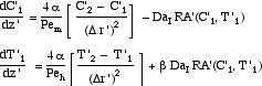 The problem is for flow and reaction as a fluid moves down a packed bed, filled with catalyst. The equations are derived elsewhere (link). Here we repeat them in nondimensional form.