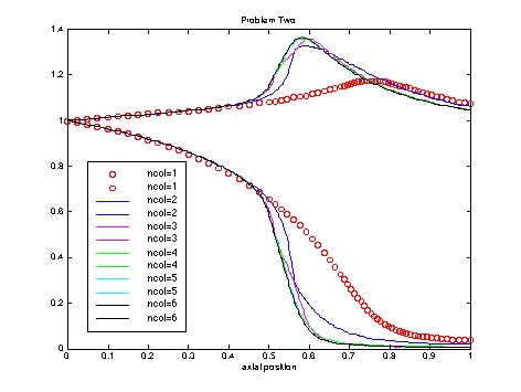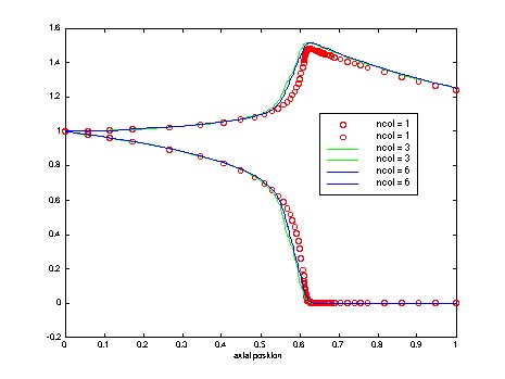 The orthogonal collocation method is applied by evaluating the differential equations at the collocation points and setting this residual to zero. We use symmetric polynomials since the solution is the same on either side of the centerline.