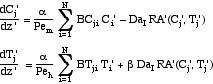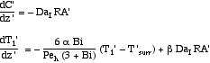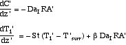 The problem is for flow and reaction as a fluid moves down a packed bed, filled with catalyst. The equations are derived elsewhere (link). Here we repeat them in nondimensional form.