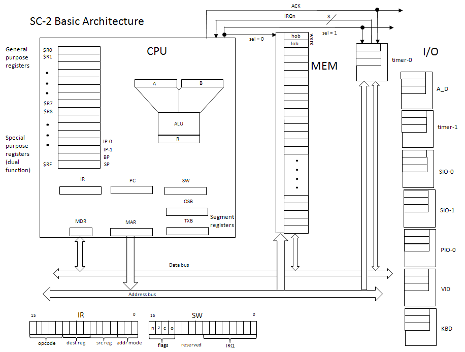 The SC-2 provides sixteen 16-bit working registers (register file). All sixteen registers can be used for data but several ($RC - $RF) are dual use (see below). Address space is 64k (216) bytes. A 16-bit word consists of two consecutive bytes with the high order byte (hob) at the lower memory address and the low order byte (lob) at the next memory address (big endian). Instructions are all one word with the singular exception of the LDA instruction which is two words long; the second word is assumed to be a full 16-bit address. However this instruction is essentially a form of load immediate with a 16-bit immediate field.