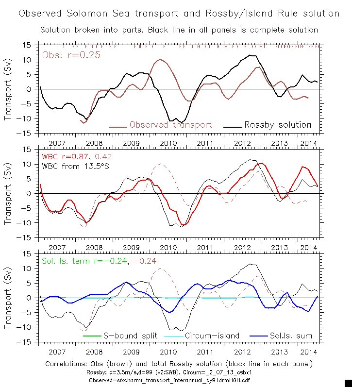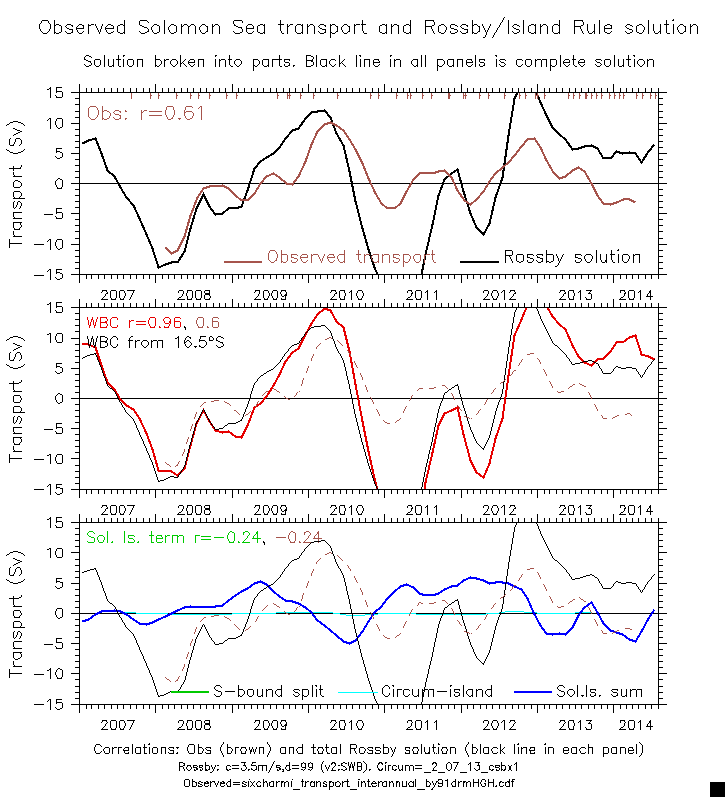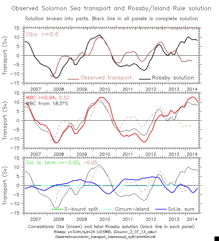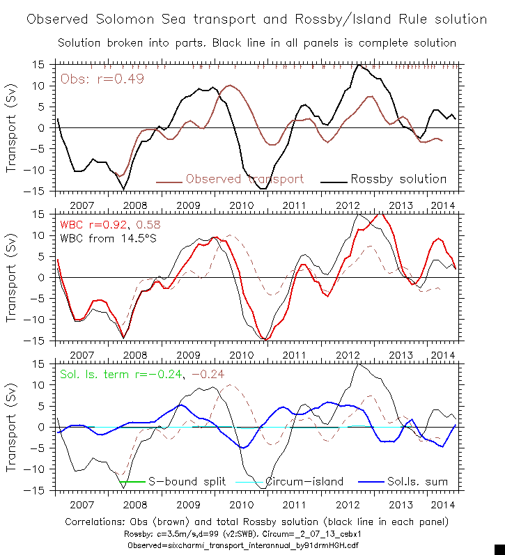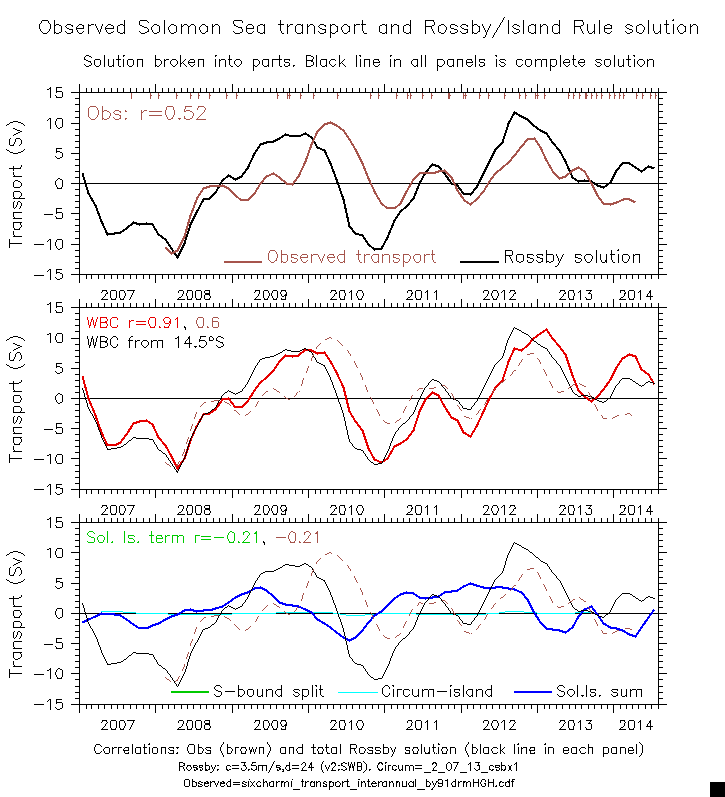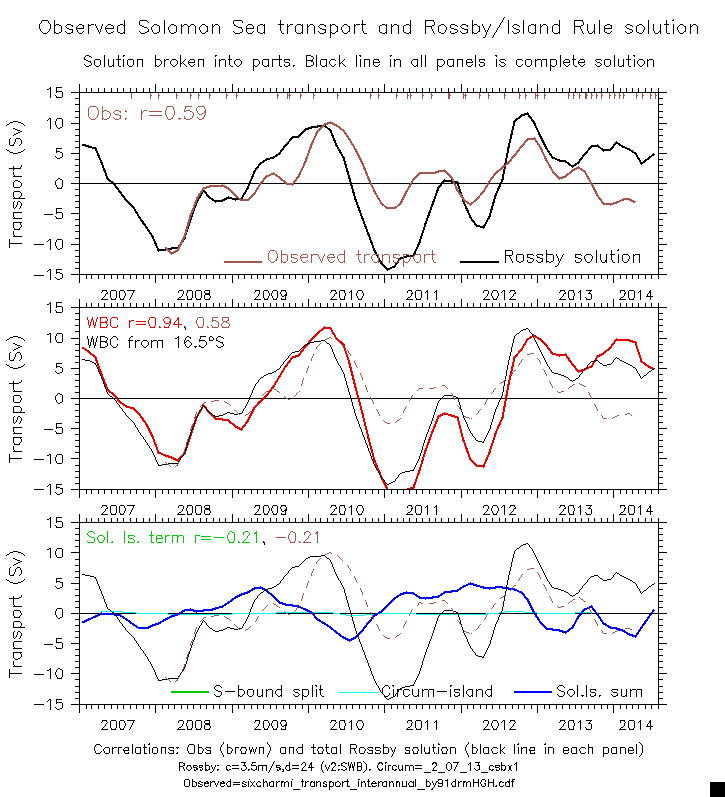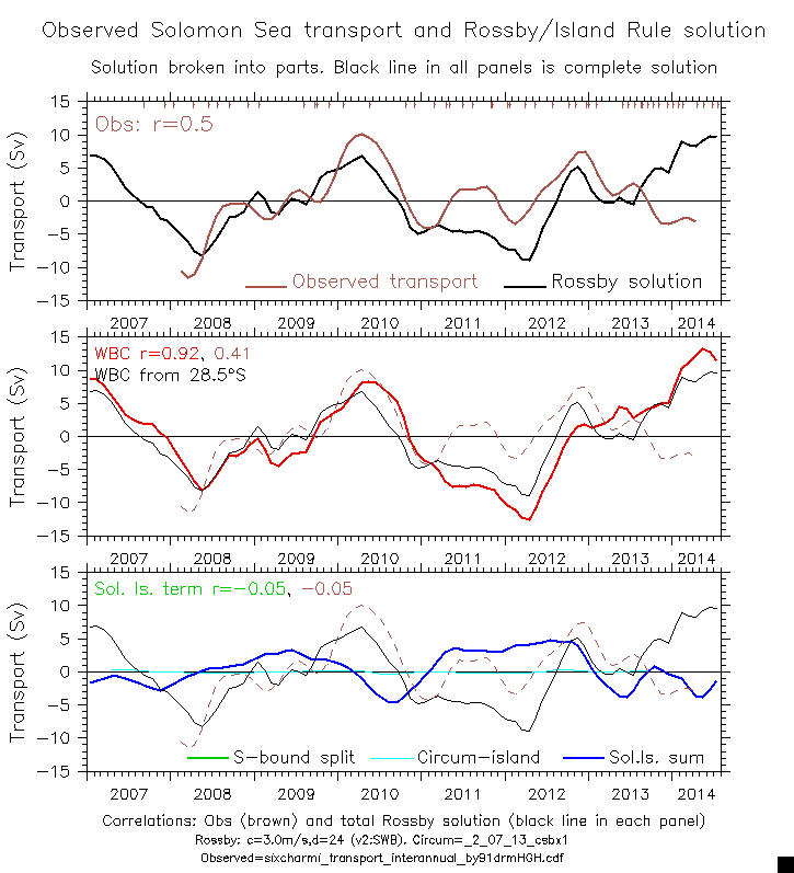 Solutions for the Rossby/TDIR Solomon Sea transport for different latitudes of zero southern boundary on the coast of Australia.