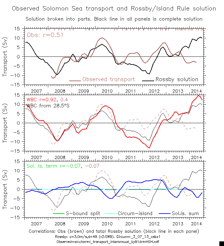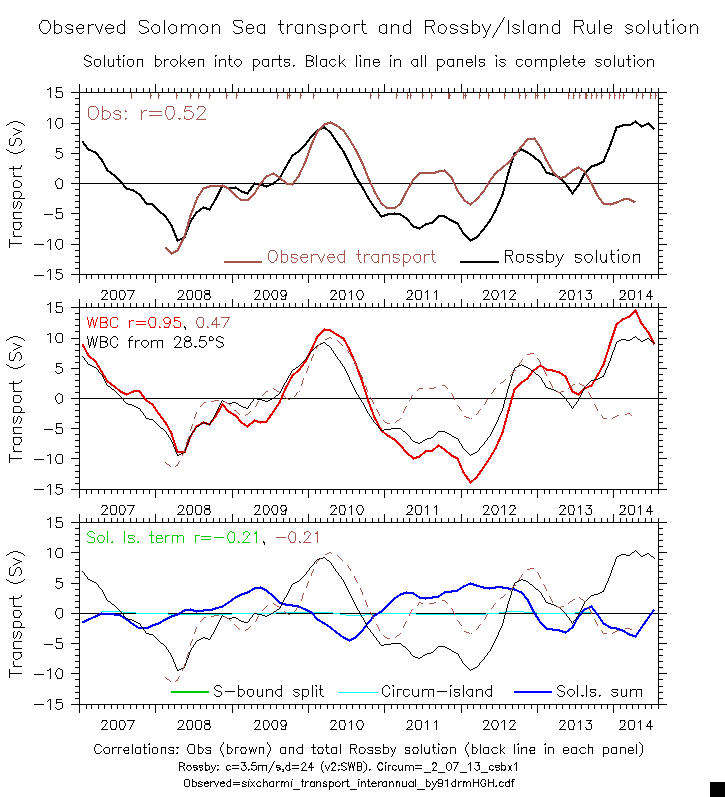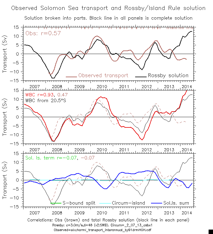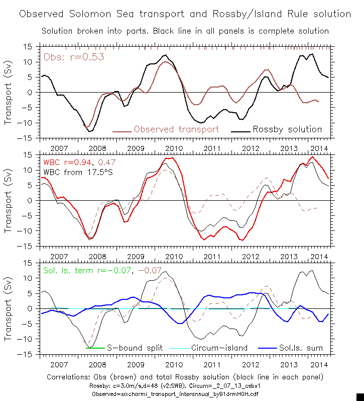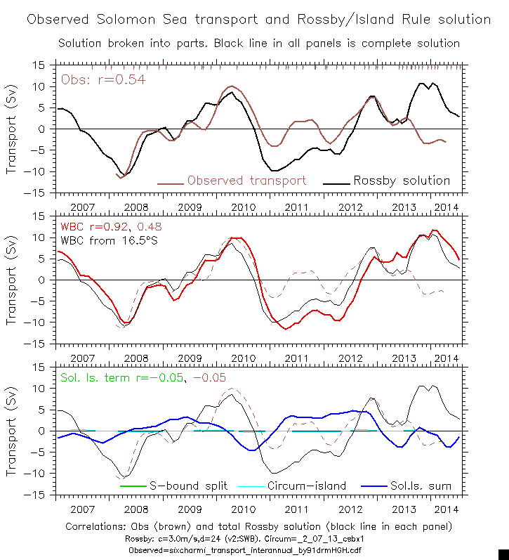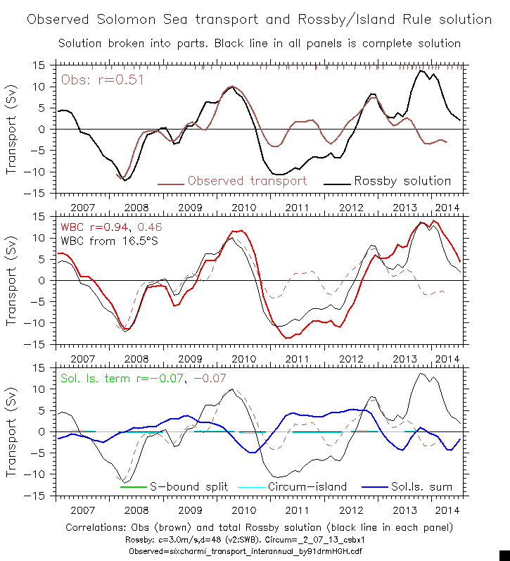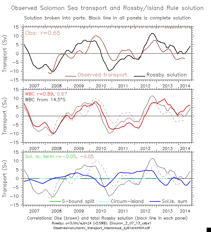 Solutions for the Rossby/TDIR Solomon Sea transport for different latitudes of zero southern boundary on the coast of Australia.