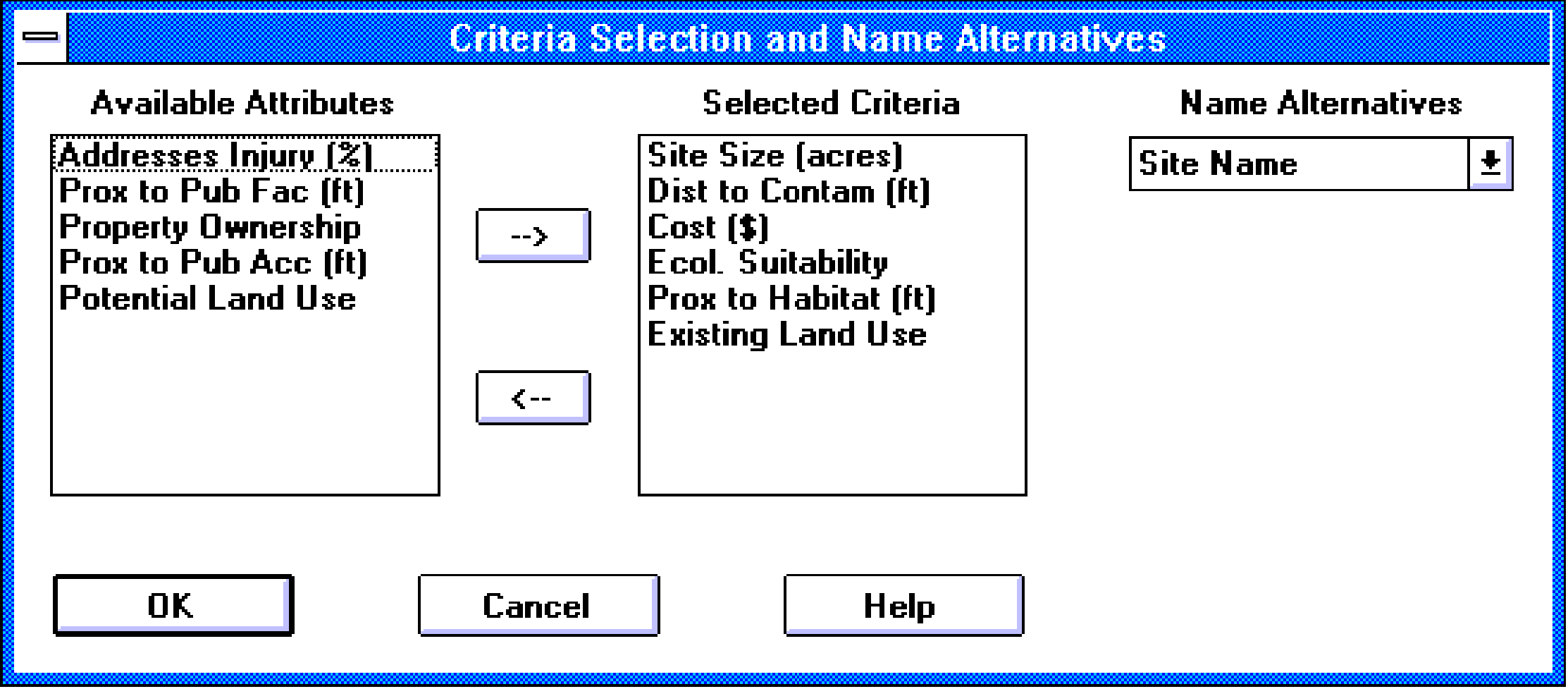 Figure 2a. The dialog box in the MCDM/Consensus module which allows the user to select the decision criteria for the modeling.