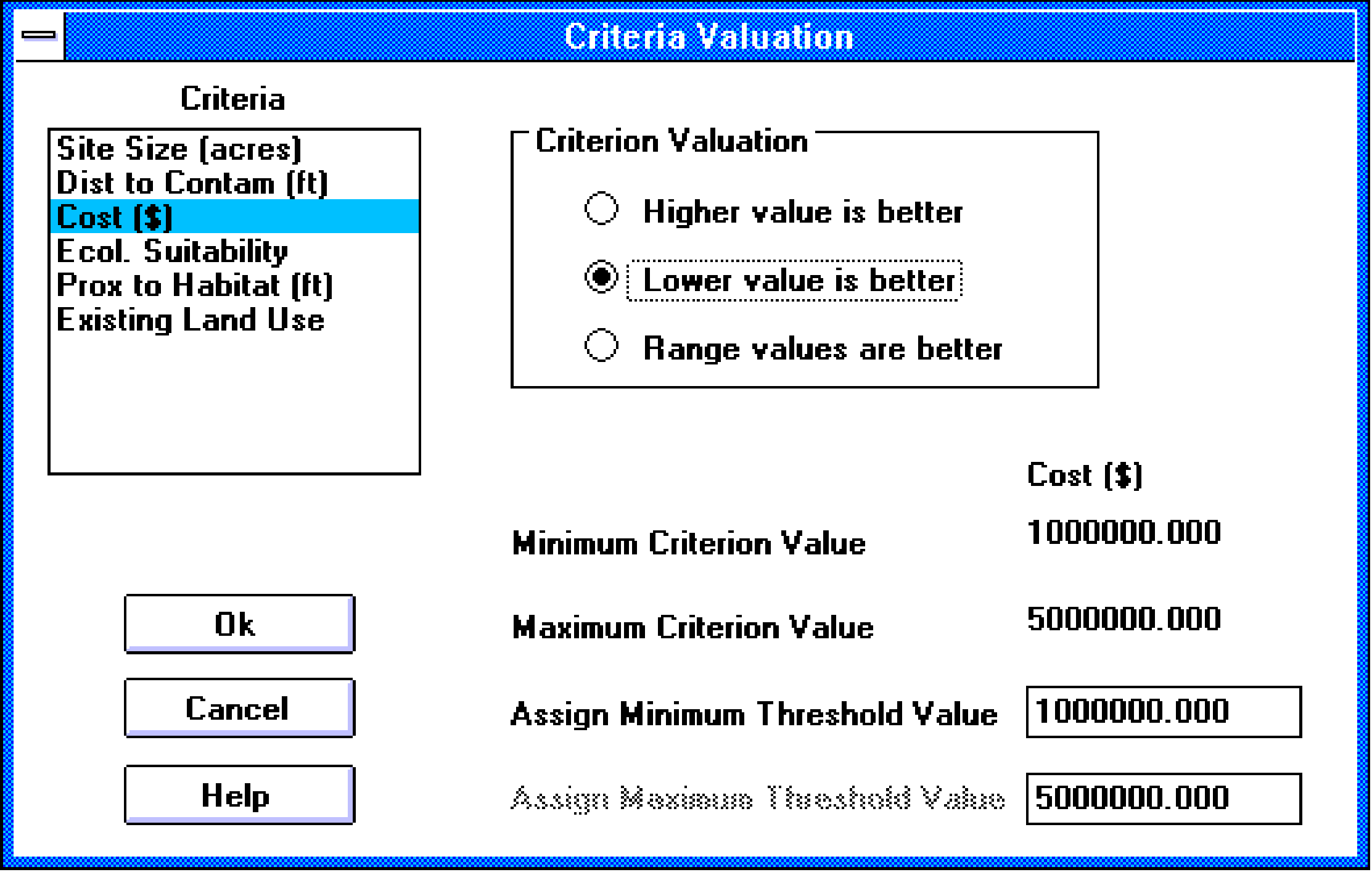 Figure 2b. The criteria valuation dialog box in MCDM/Consensus. The user selects how the standardized criterion scores will be calculated.