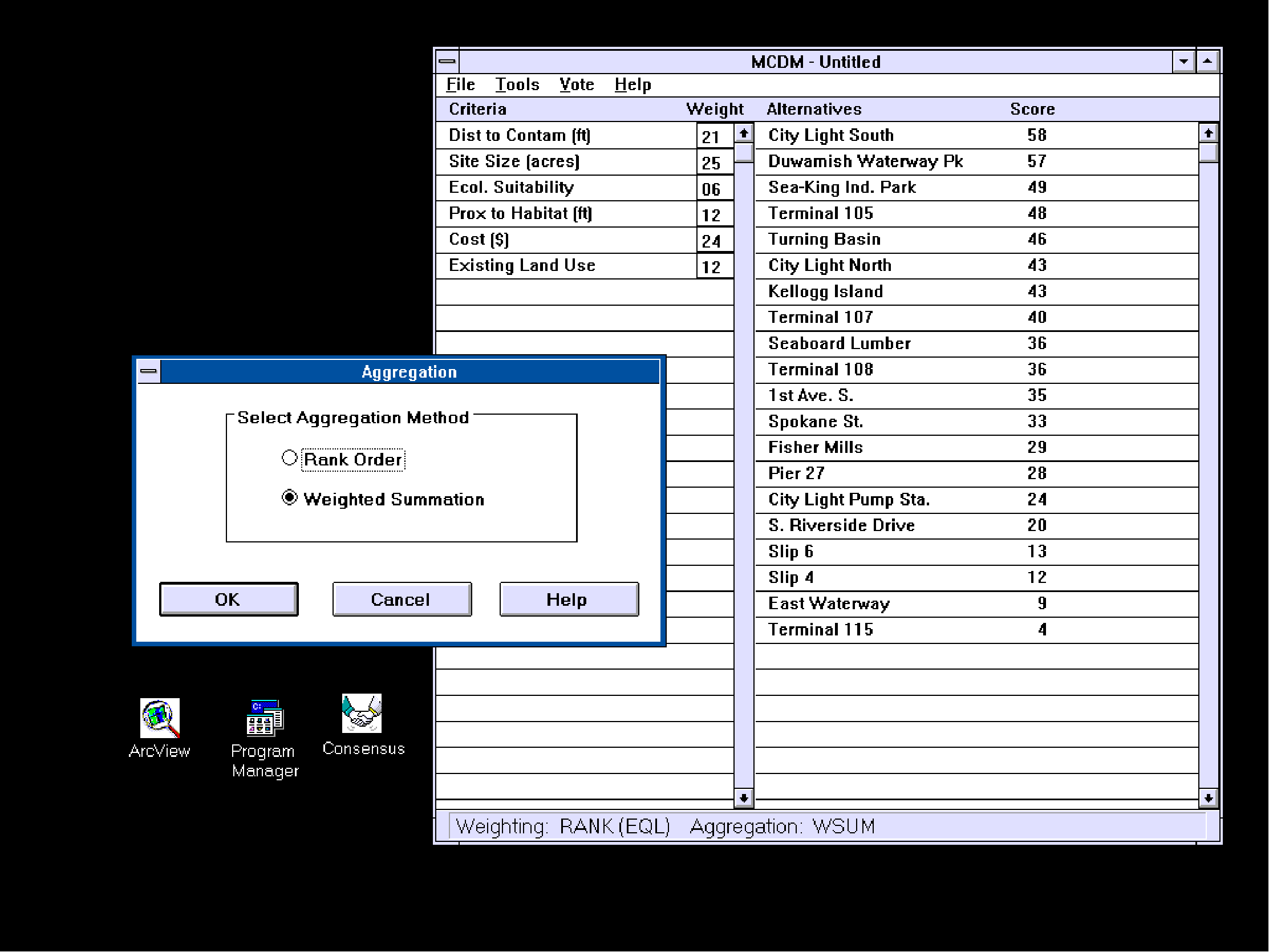 Figure 4b. The main MCDM window with the dialog box for selecting the aggregation method.