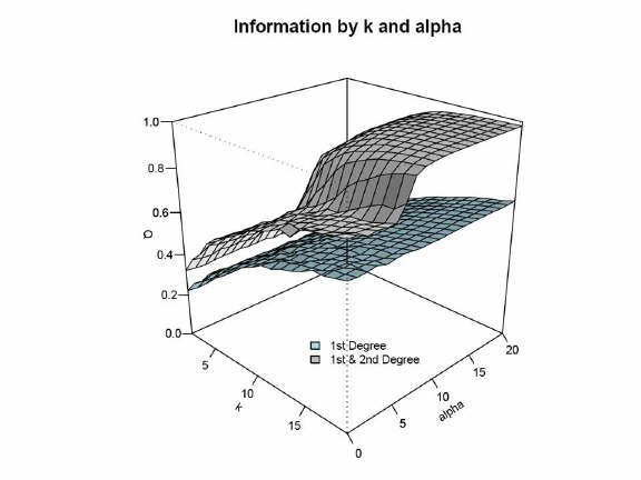 This figure shows the shape of the information advantage available when actors use both first and second order network ties to search for jobs. Here k is the mean degree of actors, and alpha is a parameter that determines the levelof local clustering in the network (0 = an extremely clustered graph; 20 = a largely random graph). Q is the proportion of all possible information to which actors have access (1.0 equals perfect information). Clustering affects information access very little if only direct ties are used; if direct and indirect ties are used, there is a phase shift in the information quantity at moderate levels of clustering. This is the mechanism by which small worlds can facilitate diffusion of information. Stovel and Fountain 2004 |