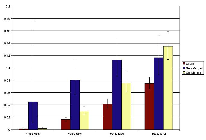 ![]() This figure reveals differences in the probability of a geographic move for men working in different types of branches, at different times. In the late nineteenth century, when career migration was extremely rare, men working in recently acquired branches were much more likely to be transferred away from their home branch than were any other Lloyds' employees. This pattern continues and amplifies through the first two decades of the twentieth century, a period of active agglomeration in British banking. Eventually, however, career migration become a common feature of all bankers' careers. Stovel and Savage 2006 |