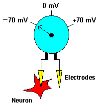 the voltage between the inside and outside of the neuron is measured,
