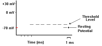 The resting potential tells about what happens when a neuron is at rest. An action potential occurs when a neuron sends information down an axon, away from the cell body. Neuroscientists use other words, such as a "spike" or an "impulse" for the action potential. The action potential is an explosion of electrical activity that is created by a depolarizing current. This means that some event (a stimulus) causes the resting potential to move toward 0 mV. When the depolarization reaches about -55 mV a neuron will fire an action potential. This is the threshold. If the neuron does not reach this critical threshold level, then no action potential will fire. Also, when the threshold level is reached, an action potential of a fixed sized will always fire...for any given neuron, the size of the action potential is always the same. There are no big or small action potentials in one nerve cell - all action potentials are the same size. Therefore, the neuron either does not reach the threshold or a full action potential is fired - this is the "ALL OR NONE" principle.
