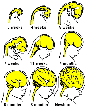 At the front end of the neural tube, three major brain areas are formed: the prosencephalon (forebrain), mesencepalon (midbrain) and rhombencephalon (hindbrain). By the 7th week of development, these three areas divide again. This process is called encephalization.