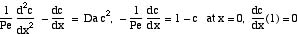 Note that for small Damköhler numbers little reaction takes place, and more reaction takes place as the Damköhler number increases. Also, as the reaction rate increases, there is a bigger jump at the inlet, since the flux (derivative) is higher then, and the value of c 1 must be bigger.