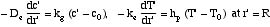 where kg and hp are mass and heat transfer coefficients of the transfer from the porous pellet to the surrounding medium. The concentration and temperature in the surrounding medium are c0 and T0, respectively, while R is the pellet radius.