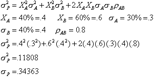 The portfolio standard deviation (risk) would be less than in (a). This is because the lower correlation (.5 vs. .8) means that these stocks tend to move together less than they did in part (a). That means that they offset eachother more often, dampening any overall swings in the portfolio, making the total standard deviation less.