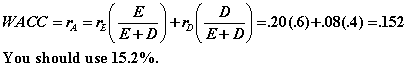 14.You work for DeBeers, the diamond mining company. You are considering starting production on a new diamond mine. The required return on your equity is 20% and your debt has a required return of 8%. Your firm is worth $1 billion dollars, $400 million of which is debt. What rate of return should you use to discount the cashflows from your new project and why is that the right return to use? (6 pts)