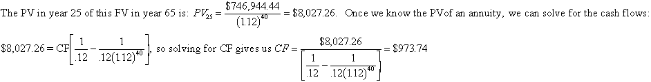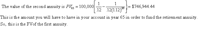 You want to have an income of $100,000 per year for 20 years when you retire. If you are 25 now, how much do you have to invest per year to reach your retirement goal? Assume that you will make your first deposit one year from now when you turn 26 and you will continue until you turn 65. You will withdraw your first $100,000 cash flow when you turn 66. Assume an interest rate of 12% per year throughout this problem. (2pts)