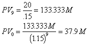 The discount rate is 15%, and the growth rate for the first one is 5%, so the PV=$10M/(.15-.05)=$100M