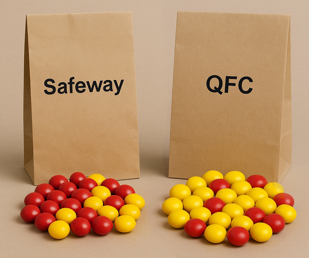 You are probably not that naive. Yes, Safeway bags contain more red candies, but there are also plenty of red ones in the QFC bags, and you can still, just by chance, get one from there.