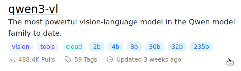 Example versions of qwen3-vl models on ollama’s models page. There are six versions of qwen3-vl, with 2, 4, 8, 30, 32 and 235 billion of parameters. One parameter is roughly one byte, so for instance, qwen3-vl:2b will download approximately 2GB of data and take 2GB of ram, but the latter may depend on the task size. On a computer with 16GB ram, you should be able to run qwen3-vl:8b, but not the 30b version. So pick your models accordingly!