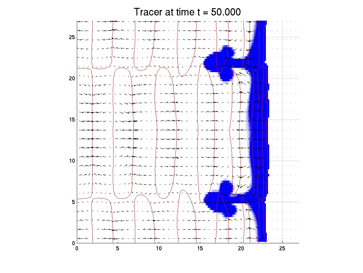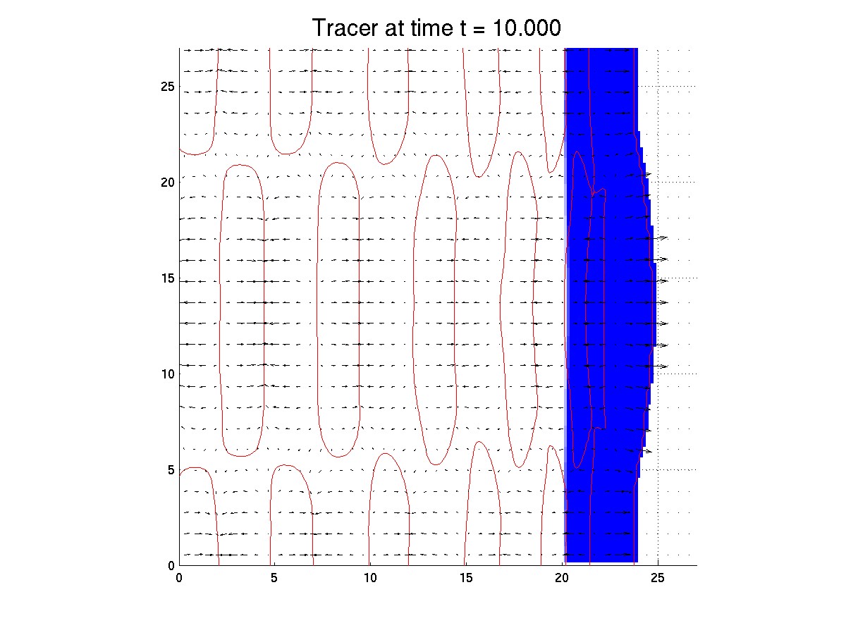 Blue = tracer, red curves = zero elevation contours