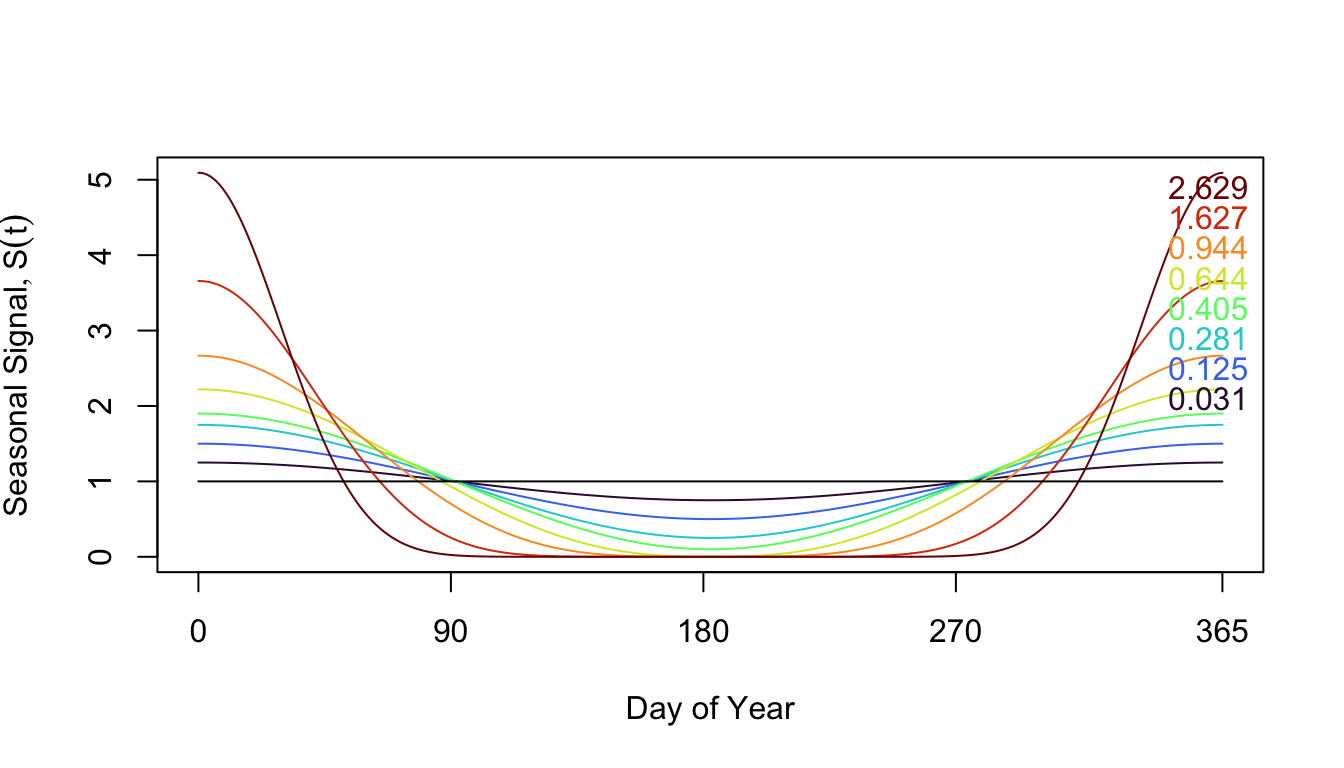 We use the index of dispersion – the variance-to-mean ratio – as a simple way of describing the average dispersion of the seasonal pattern. The index of dispersion of the seasonal pattern is defined as \[ \left(\frac{1}{\bar E}\right)^2 \int_0^{365} \frac{(\bar E - E(t))^2}{365} dt = \int_0^{365} \frac{(1 - S(t))^2}{365} dt \]