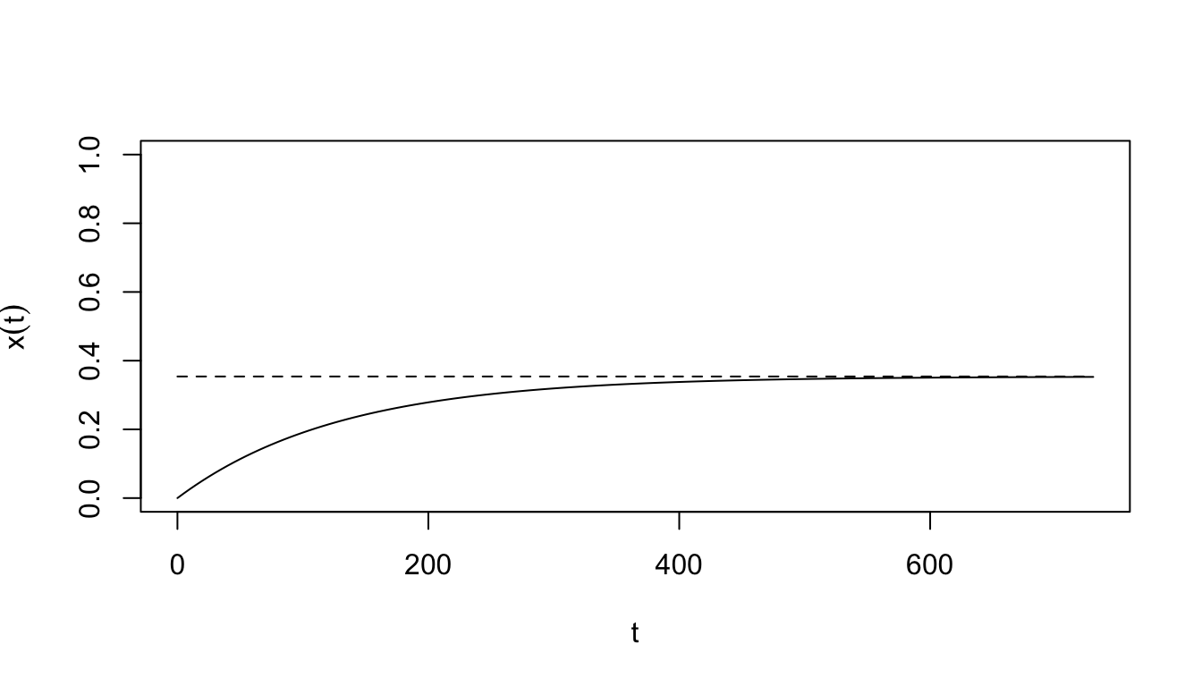 If \(h\) is constant, then we can easily compute prevalence at the steady state (denoted \(\bar x\)):