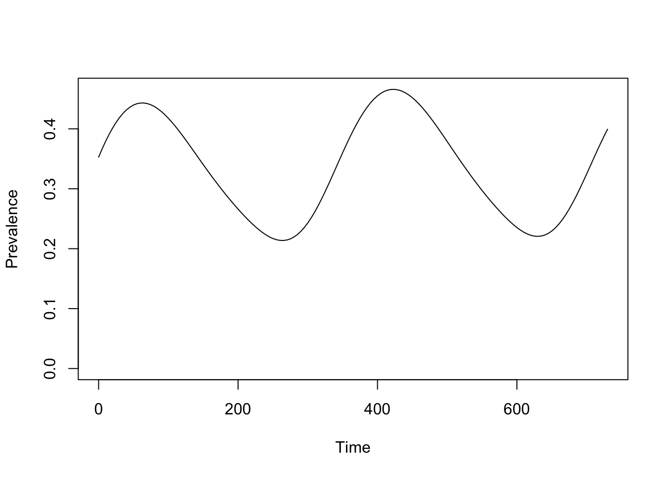 One advantage of the numerical approach is that it is not constrained by the need to find closed form solutions. For example, suppose that the FoI has a seasonal pattern: