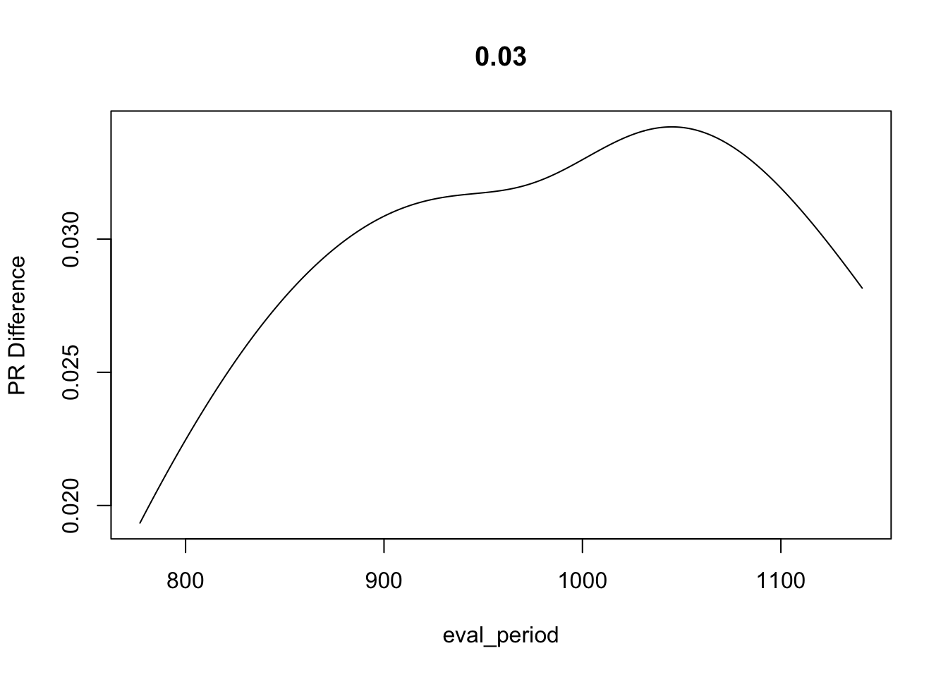 impact plot(eval_period, pr1-pr, type = "l", ylab = "PR Difference", main = round(impact*1000)/1000)