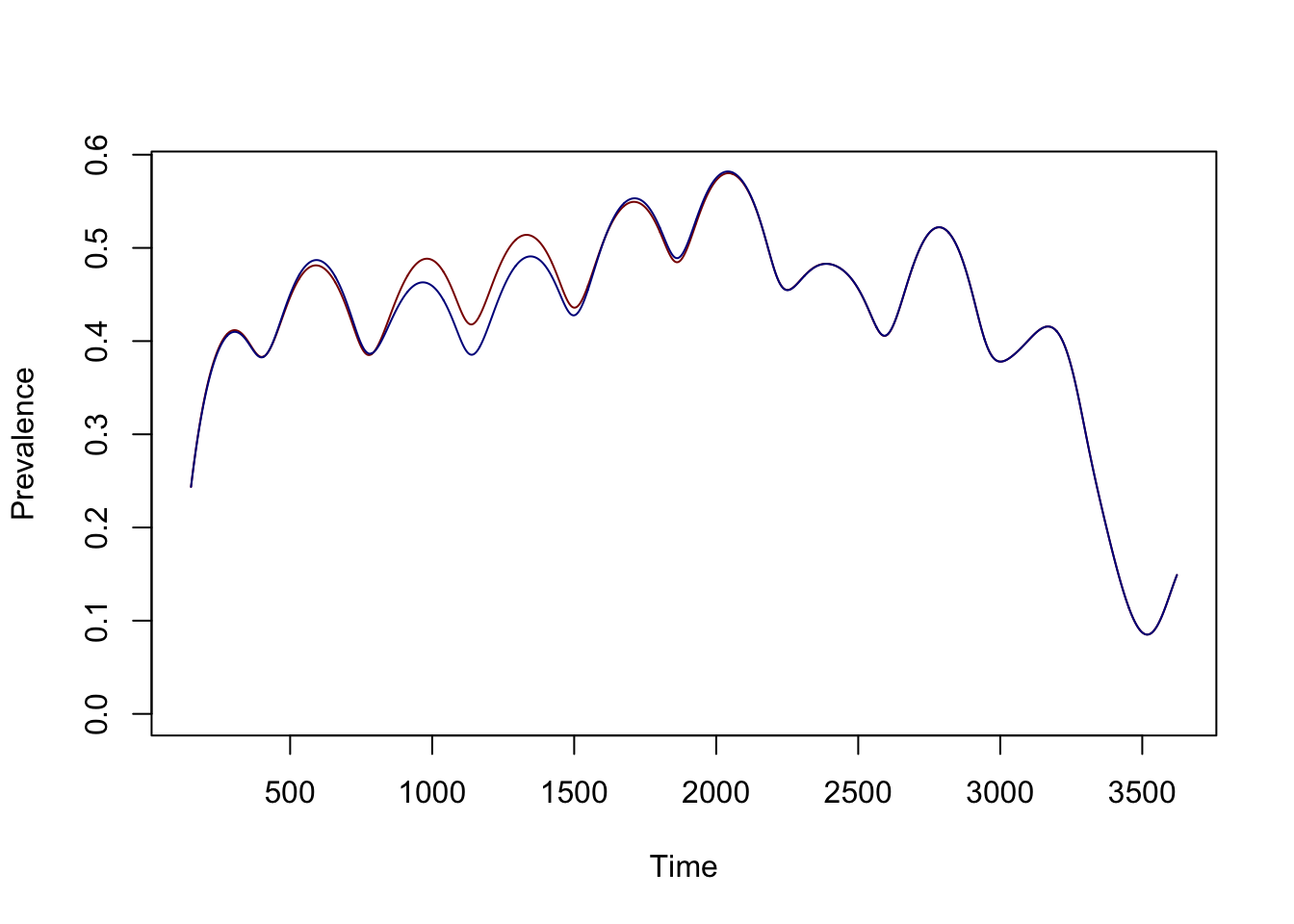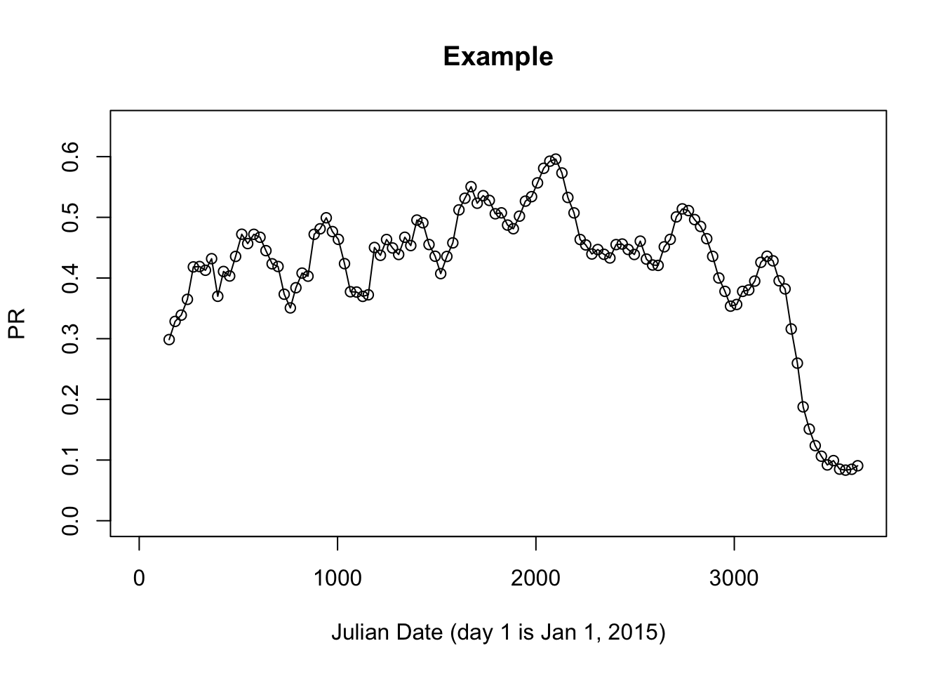 plot(jdates, pfpr, ylim = c(0,0.65), main = "Example", xlab = "Julian Date (day 1 is Jan 1, 2015)", ylab = "PR", xlim = range(0, jdates))