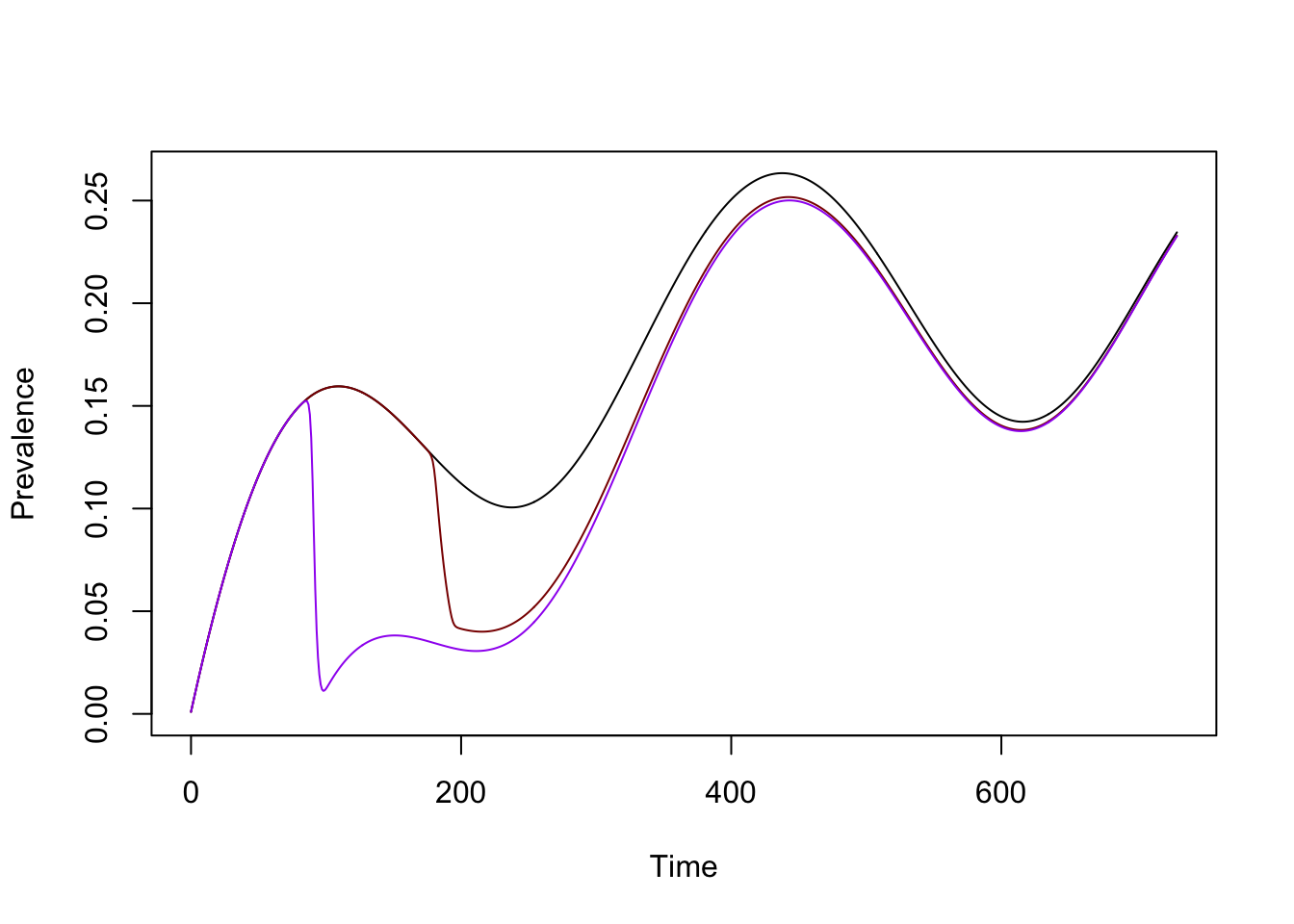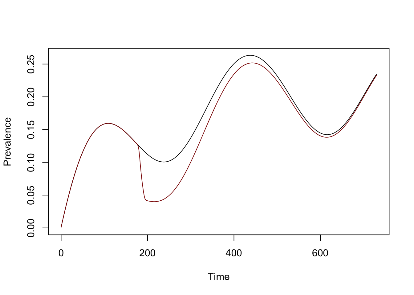 In the SIS model, implemented in a generalized form with demographic change, setup creates a function \(\xi(t)\) to simulate mass treatment, but then sets it equal to zero (i.e. the function F_zero