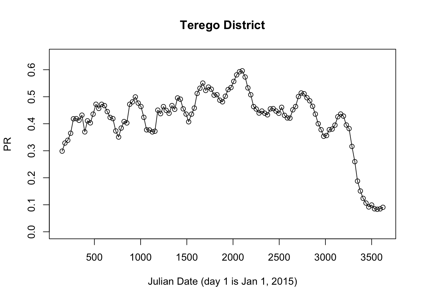 plot(jdate, pfpr, ylim = c(0,0.65), main = "Terego District", xlab = "Julian Date (day 1 is Jan 1, 2015)", ylab = "PR")