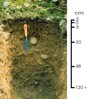 - 0-6 cm; very dark brown (10YR2/2) very gravelly sandy